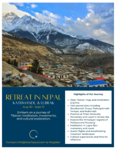 I would like to warmly invite you to join me for a very special journey to Nepal from August 30 to September 10, 2026. This retreat will take us through Kathmandu, Pokhara, Jomsom, and Lubra, offering a unique opportunity to practice together while visiting sacred places connected to the Bön and Tibetan yogic traditions. And going back to the retreat place where my dear Teacher, Yongdzin Tenzin Namdak Rinpoche, stayed in Tukdam for 8 days, after passing away at 100 years old.